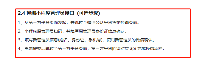 https://developers.weixin.qq.com/doc/oplatform/Third-party_Platforms/2.0/product/Register_Mini_Programs/fast_registration_of_mini_program.html#_2-4-%E6%8D%A2%E7%BB%91%E5%B0%8F%E7%A8%8B%E5%BA%8F%E7%AE%A1%E7%90%86%E5%91%98%E6%8E%A5%E5%8F%A3%EF%BC%88%E5%8F%AF%E9%80%89%E6%AD%A5%E9%AA%A4%EF%BC%89