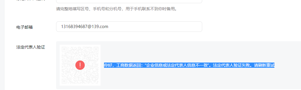 检查一下你们公司在工商信息网登记的法人代表,确认一下注册人是不是同一个人,公司法人是A,注册人信息是B应该就会出现这个情况,排除这个情况 新公司可能也会有审核时间等,再不行的话可以试着找官方 提供一下自己营业执照,让他们人工验证一次就可以了