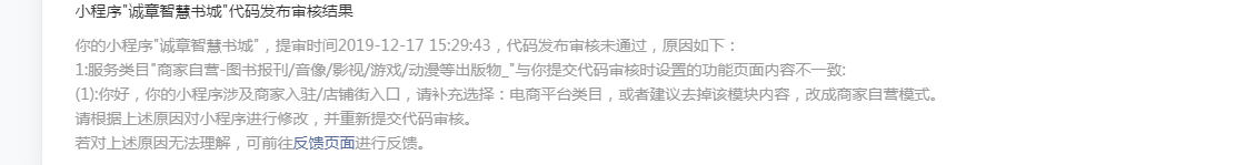 你好,经核实,贵方小程序最新提审版本仍涉及商家入驻入口,需补充选择电商平台类目,或建议自查代码,确保包括前端展示、小程序代码等整体均移除:入驻入口内容,再提交代码审核。(详图如下)