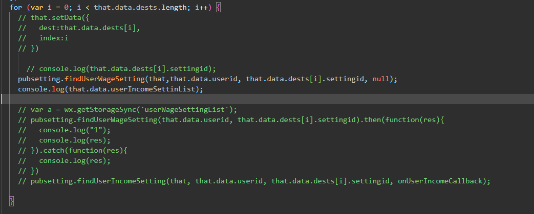 function findUserWageSetting () { return new Promise(resolve => { success: (res) => { .. resolve(res) } }) } .. async function () { await pubsetting.findUserWageSetting(..) .. }
