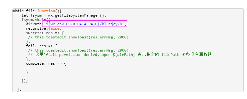 mkdir_file:function(){ let fsysm = wx.getFileSystemManager(); fsysm.mkdir({ dirPath: '${wx.env.USER_DATA_PATH}/bluejoy/b', recursive: false, success: res => { // this.toastedit.showToast(res.errMsg, 2000); }, fail: res => { // this.toastedit.showToast(res.errMsg, 2000); // 这里报fail permission denied, open ${dirPath} 表示指定的 filePath 路径没有写权限 }, complete: res => { } }); }, |