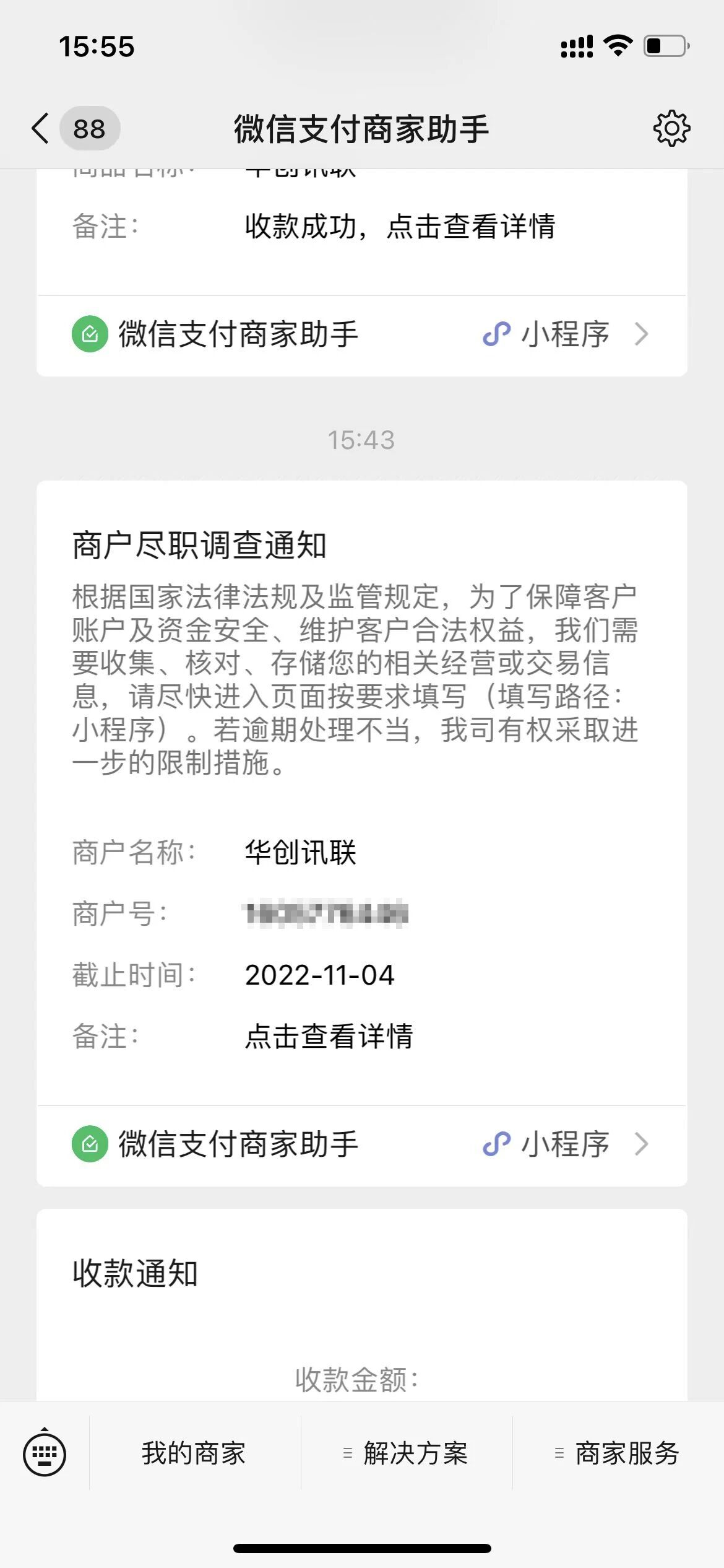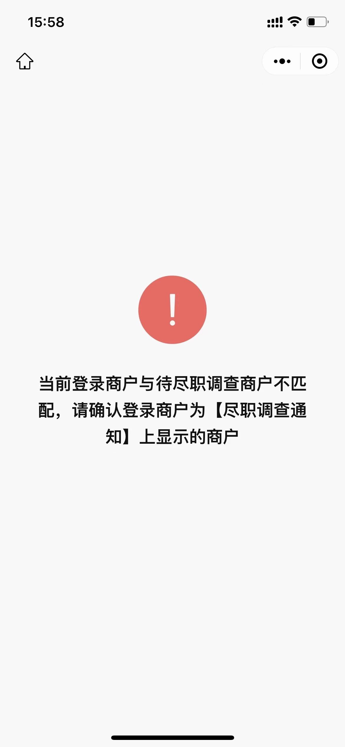 收到微信支付商家助手发来的商户尽职调查通知,但是不知道去哪里填写信息啊,点击点击改信息跳转出来说当前登录商户与待尽职调查商户不匹配,这是什么情况啊?登录商户中心,查看站内信也没有看到相关的消息,麻烦帮忙看下解决下!!!