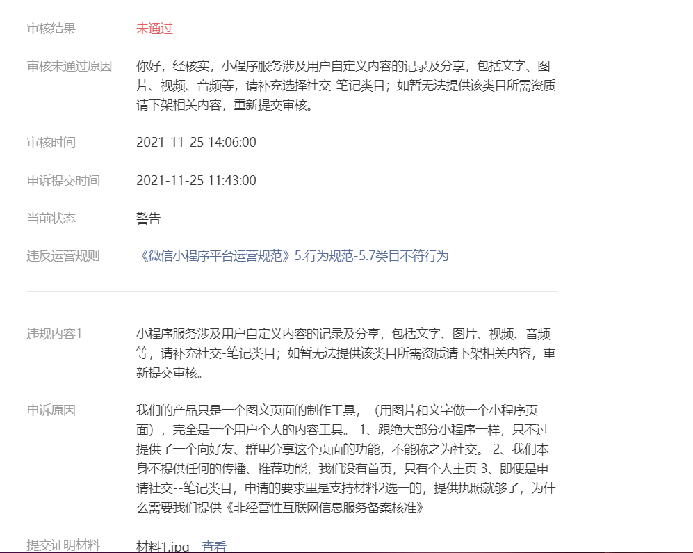 被处罚之后,我翻看了下历史信息,发现确实有人上传了违规内容,属于罚得不冤,所以立刻紧急上线了审核机制,把之前的内容状态都调成了未审核,然后发起了申诉。这一点微信目前还没做二次check。1-7天的申诉太长了,这根本不给个人开发者活路