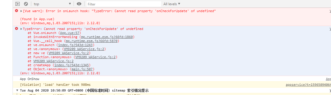 找到问题后,我设置了一个全局变量,通过判断scene值,进入场景,从而去判断是否执行检查更新版本代码,后此错误解除(同理,广告加载的时候,也会出现此错误,我也用此方法解决)