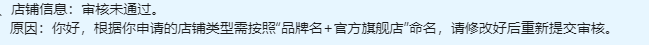 你好,根据你申请的店铺类型需按照”品牌名+官方旗舰店”命名,请修改好后重新提交审核.