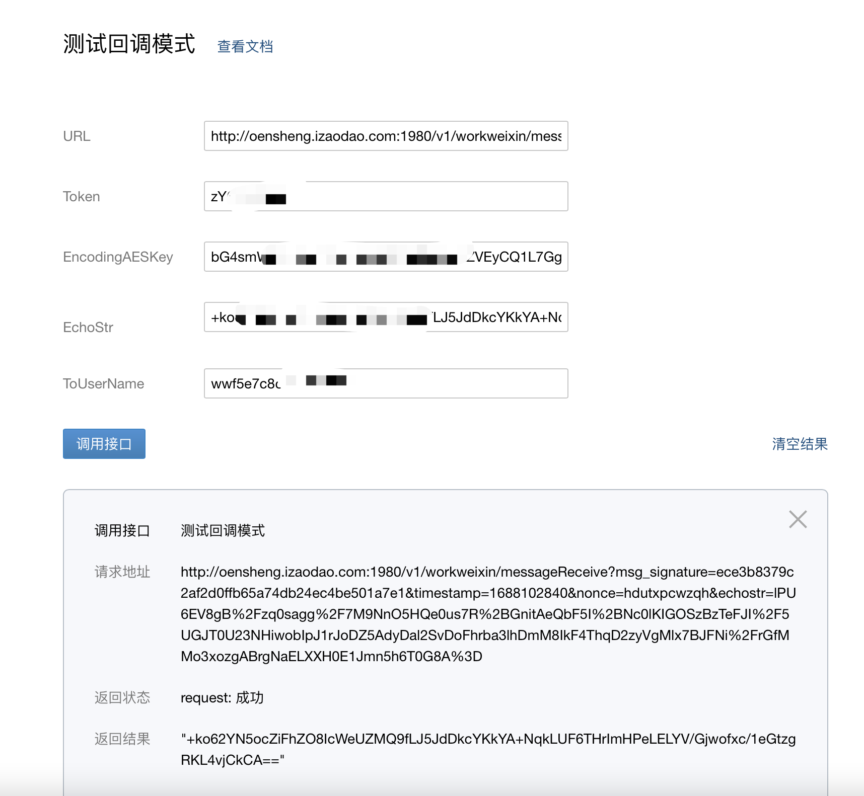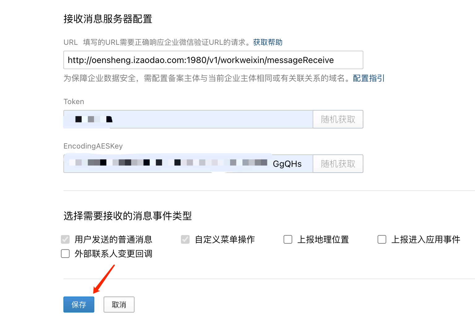设置的get请求地址为http://oensheng.izaodao.com:1980/v1/workweixin/messageReceive