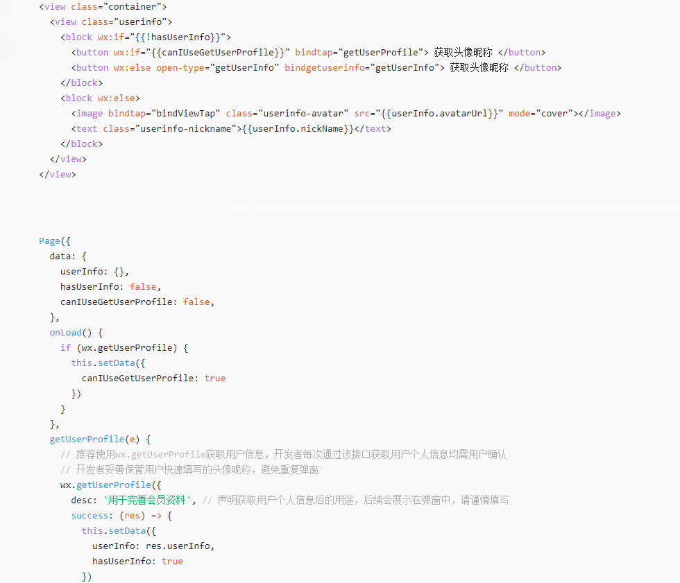 请开发者使用 getUserProfile 获取用户信息。 小程序登录、用户信息相关接口调整说明:https://developers.weixin.qq.com/community/develop/doc/000cacfa20ce88df04cb468bc52801