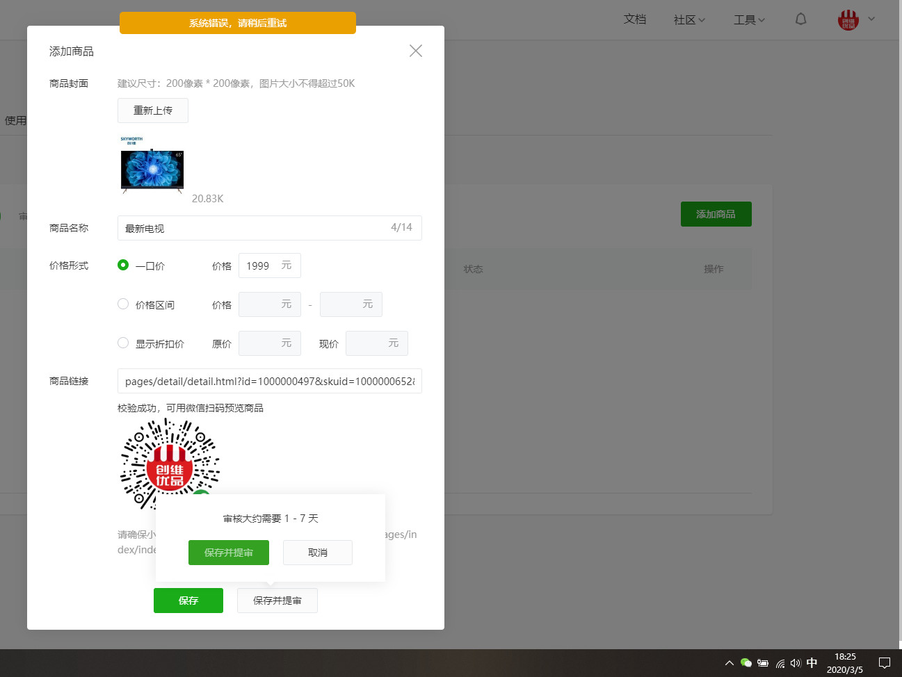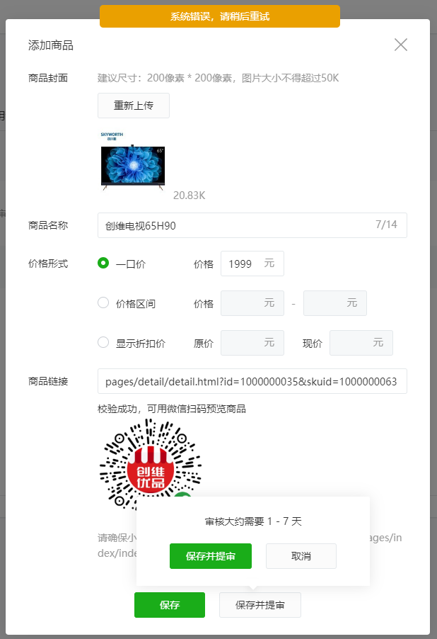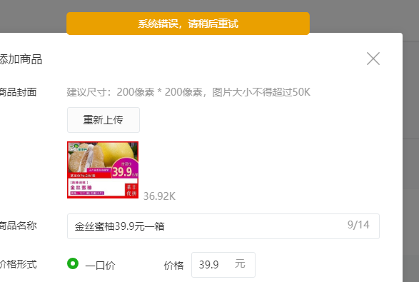 创建好直播间后,前往商品库添加商品,但一直提示系统异常