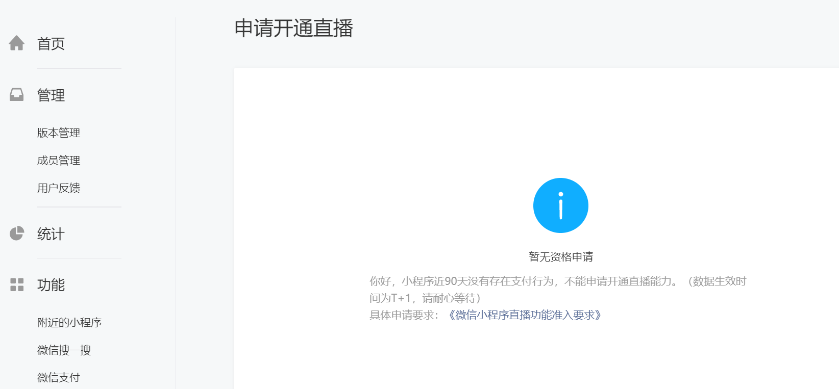小程序直播功能准入要求如下https://developers.weixin.qq.com/miniprogram/product/live/access-requirement.html