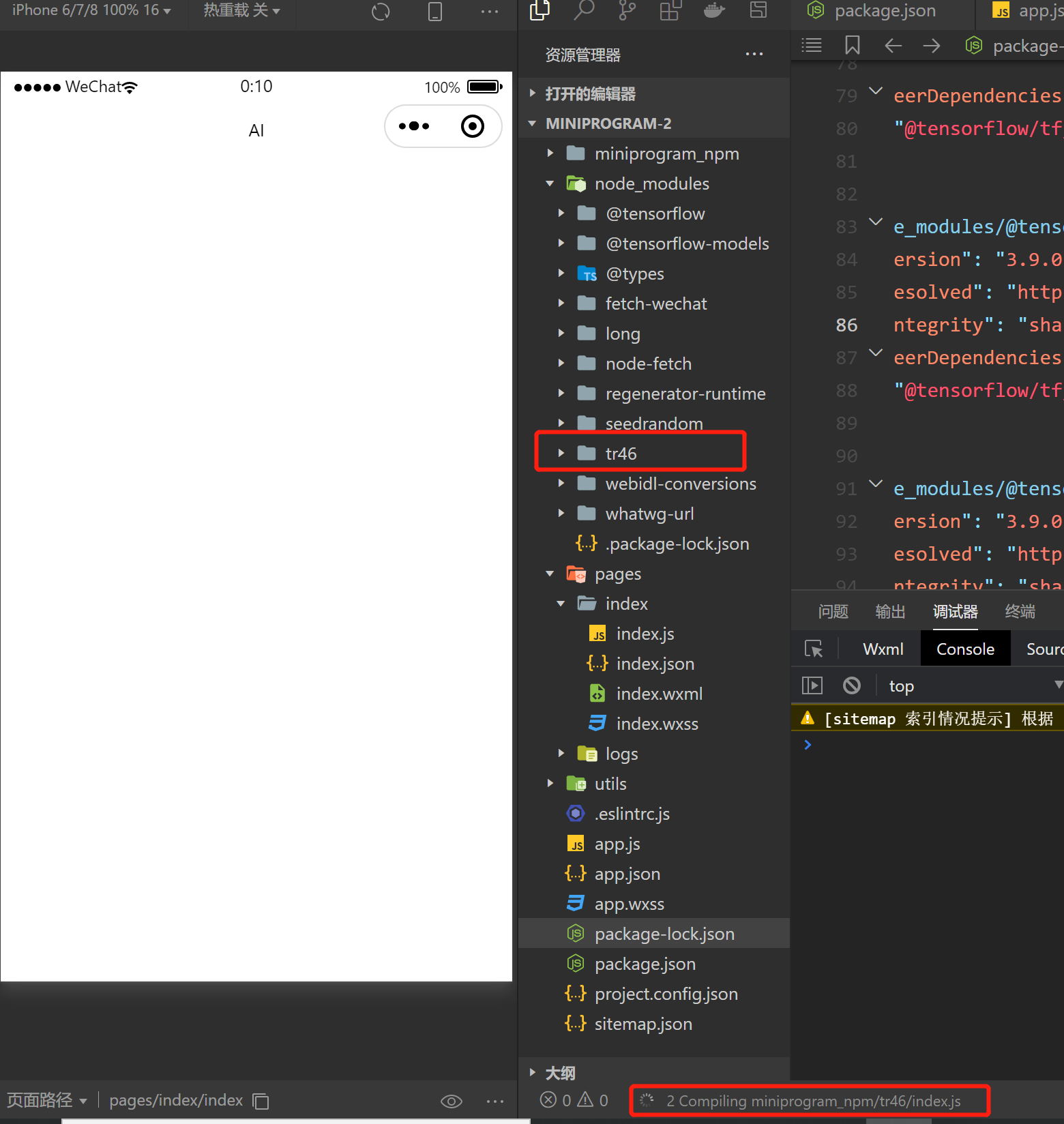 1.npm init ,npm install @tensorflow/tfjs-core @tensorflow/tfjs-converter @tensorflow/tfjs-backend-webgl @tensorflow/tfjs-backend-cpu fetch-wechat crypto-js(解决 找不到crpyto.js 错误)