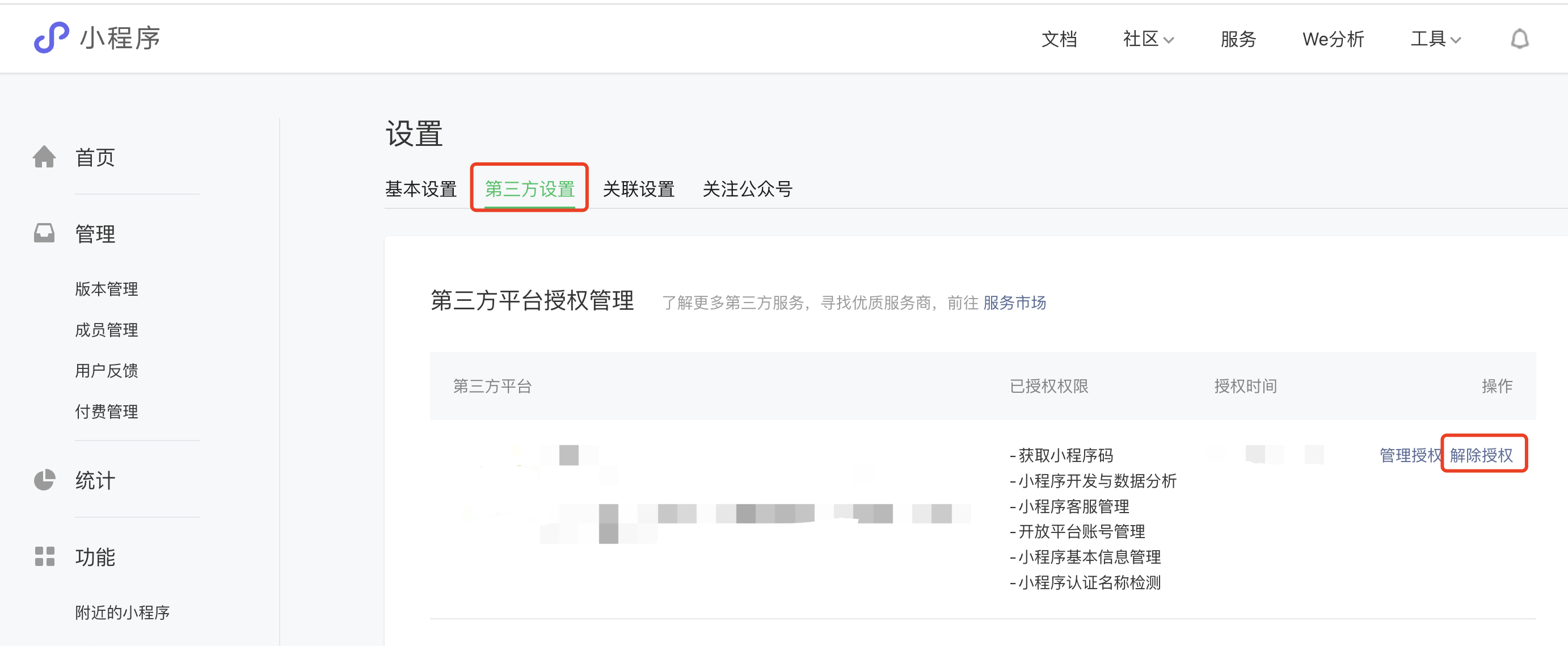 如果要解绑第三方授权,请通过https://mp.weixin.qq.com扫码登录你的小程序后