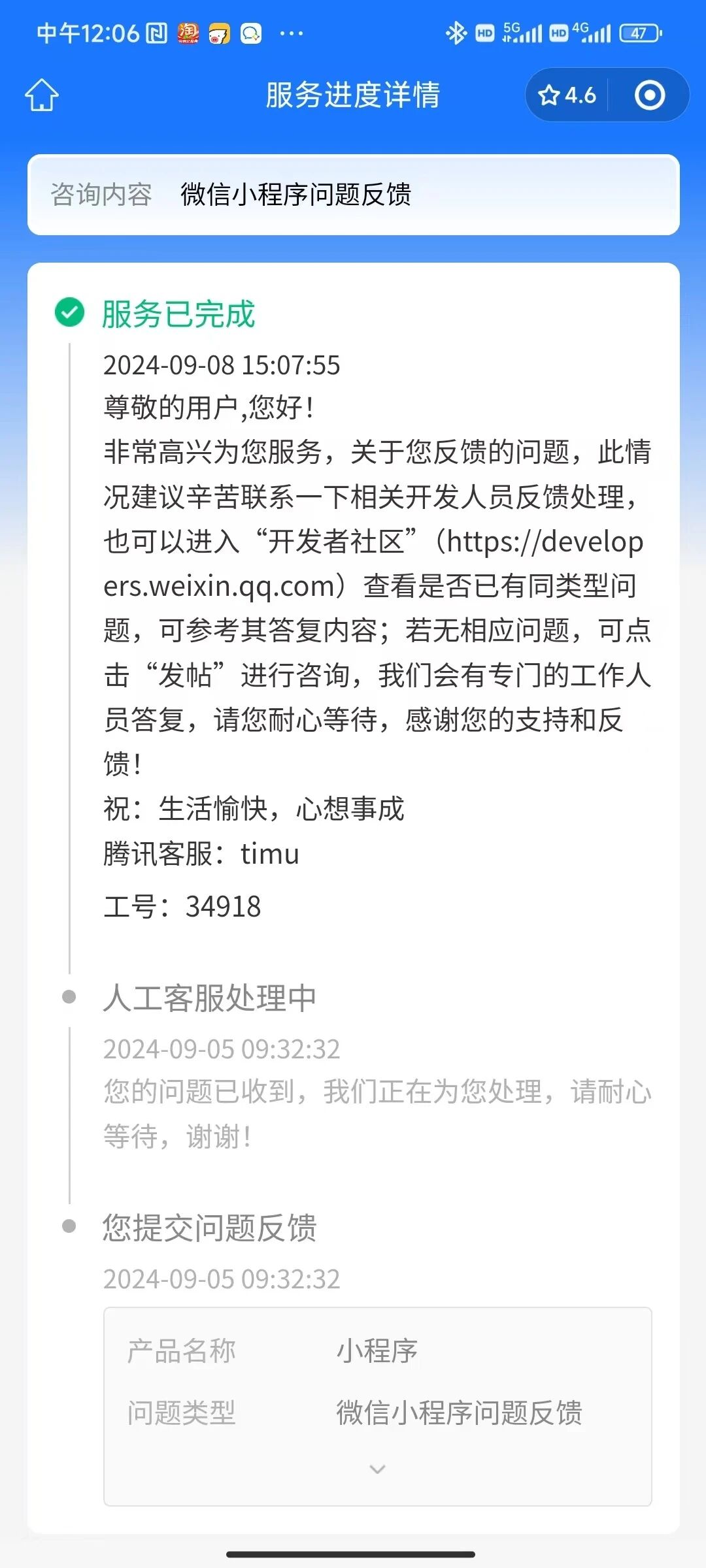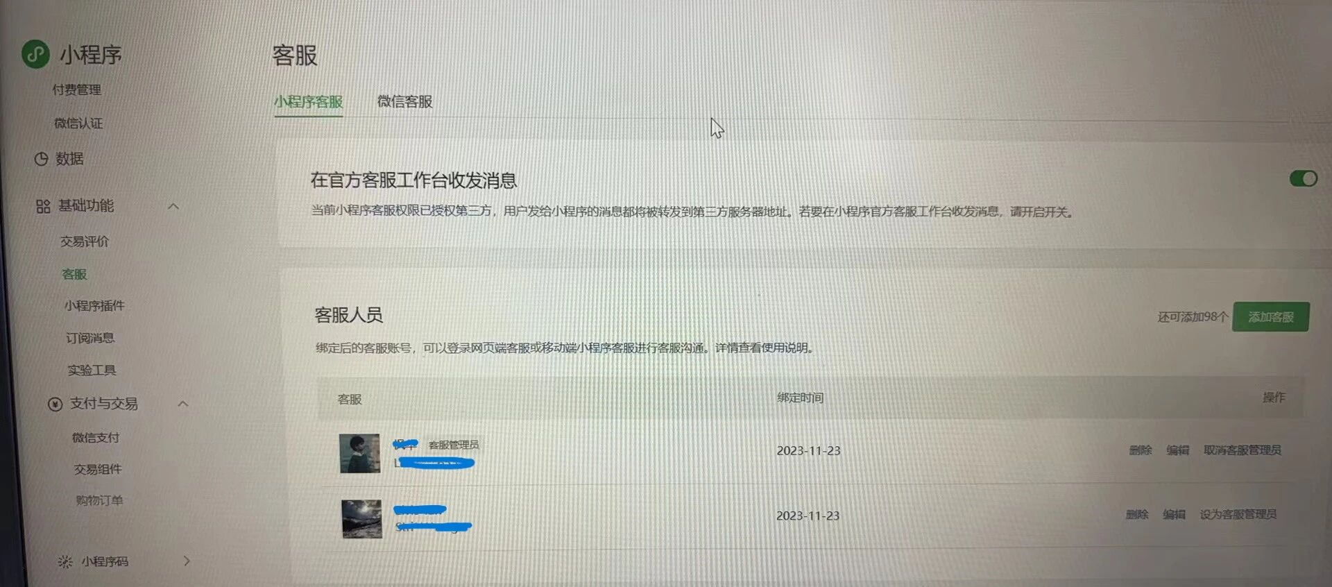 小程序要使用企业微信的微信客服功能(免开发模式),但是企业微信绑定小程序的时候不成功,询问企业微信客服后,企业微信客服表示企业微信侧操作正常,可能是小程序客服这边的设置问题,所以想请问小程序侧官方后台管理要如何配置?有什么注意点嘛?目前小程序客服由API解接管的,是不是要使用企业微信的微信客服免开发模式,就无法由API接管了,跟这个是否有关?图一是企业微信客服的回复,图二是腾讯客服的回复,图三是小程序客服目前的设置