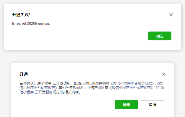 创建云开发demo 后报错80203,打开云开发面板报错 80205、