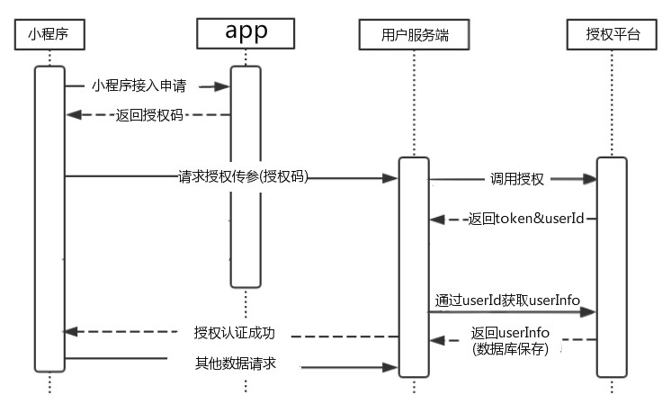 微信可以接入基于微信第三方开发平台开发的小程序,并可以通过微信本身授权登录,平台可以拿到微信用的的账号相关信息,然后保存到数据库中,那么在我们自己的app也可以开发介入第三方服务,来先看下时序图: