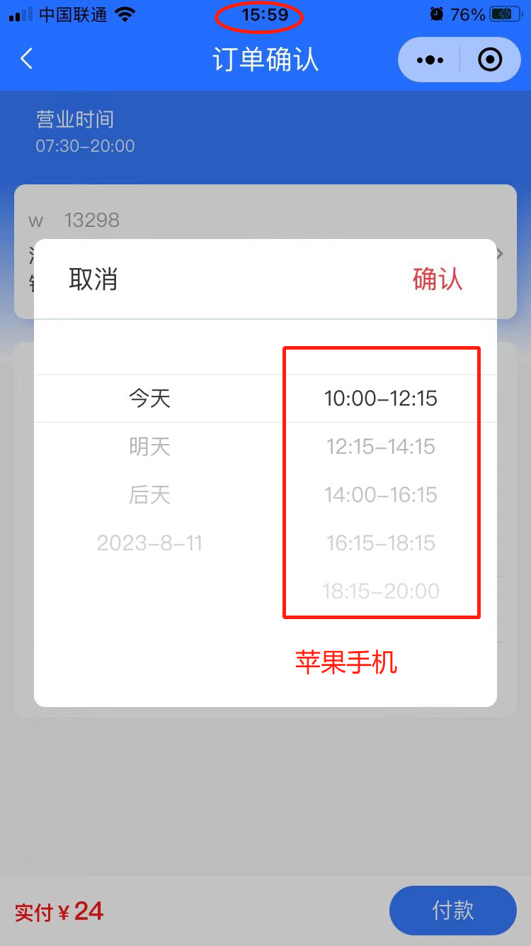 时间选择切换,如果选择的时间是 今天,则时间段,只显示当前时间之后的时间段,之前的时间段用splice移除。但是苹果手机没有移除,安卓手机显示正常的。