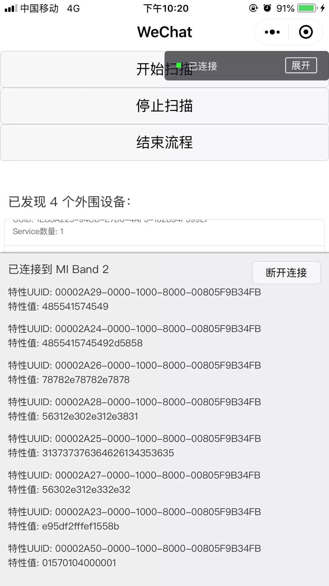 demo是官方的 连接的设备是小米手环2 然后获取一大堆的服务还有特征uuid 求大佬指条明路接下来怎么样才能获取到小米手环的信息(例如步数心率) 看了下BLE的东西 不是特别懂 本人是前端开发 运行效果如下图
