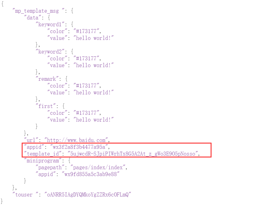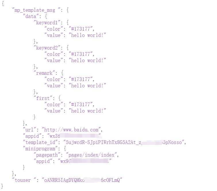 {"mp_template_msg ":{"data":{"keyword1":{"color":"#173177","value":"hello world!"},"keyword2":{"color":"#173177","value":"hello world!"},"remark":{"color":"#173177","value":"hello world!"},"first":{"color":"#173177","value":"hello world!"}},"url":"http://www.baidu.com","appid":"wx9fd855a5c3ab9e88","template_id":"5ujwcdR-SJpiPIWrhTx8G5A2At_z_gWo3E9O5pNosso","miniprogram":{"pagepath":"pages/index/index","appid":"wx9fd855a5c3ab9e88"}},"touser ":"oANRR5IAgDYQMkoYgZZRx6cOFLmQ"}