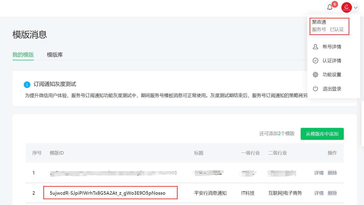 5、使用的模板消息是在公众号下选择的模板,模板id确实也确实属于该公众号下