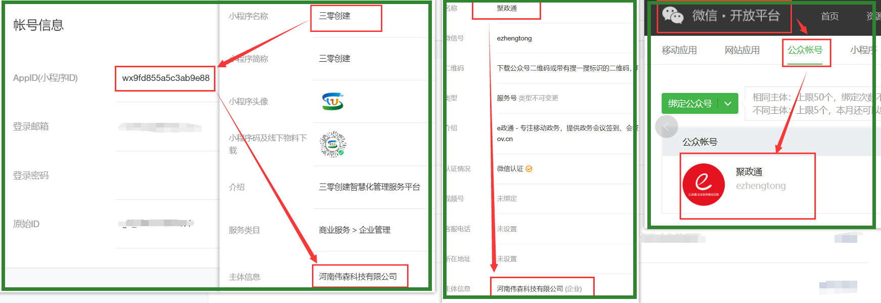 3、小程序与公众号是关联绑定关系,并且账号主体都是:河南伟森科技有限公司