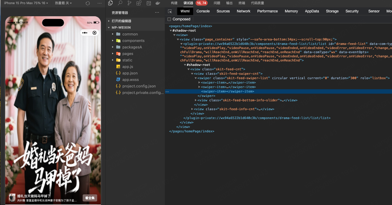 打开编辑器里看,总共有三部剧,其中有一个swiper-item里没数据,正常直接进入刷剧页时,swiper-item都有值,三部剧都可以正常播放,