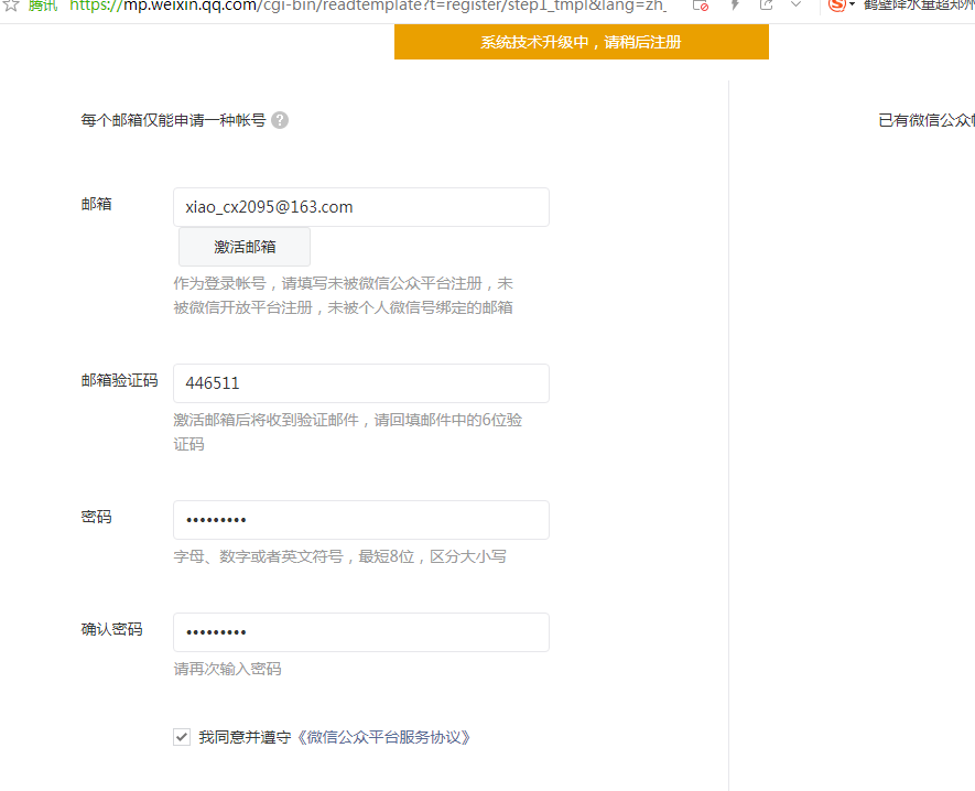 注册公众号,显示系统技术升级中,什么时候能好,急急急!