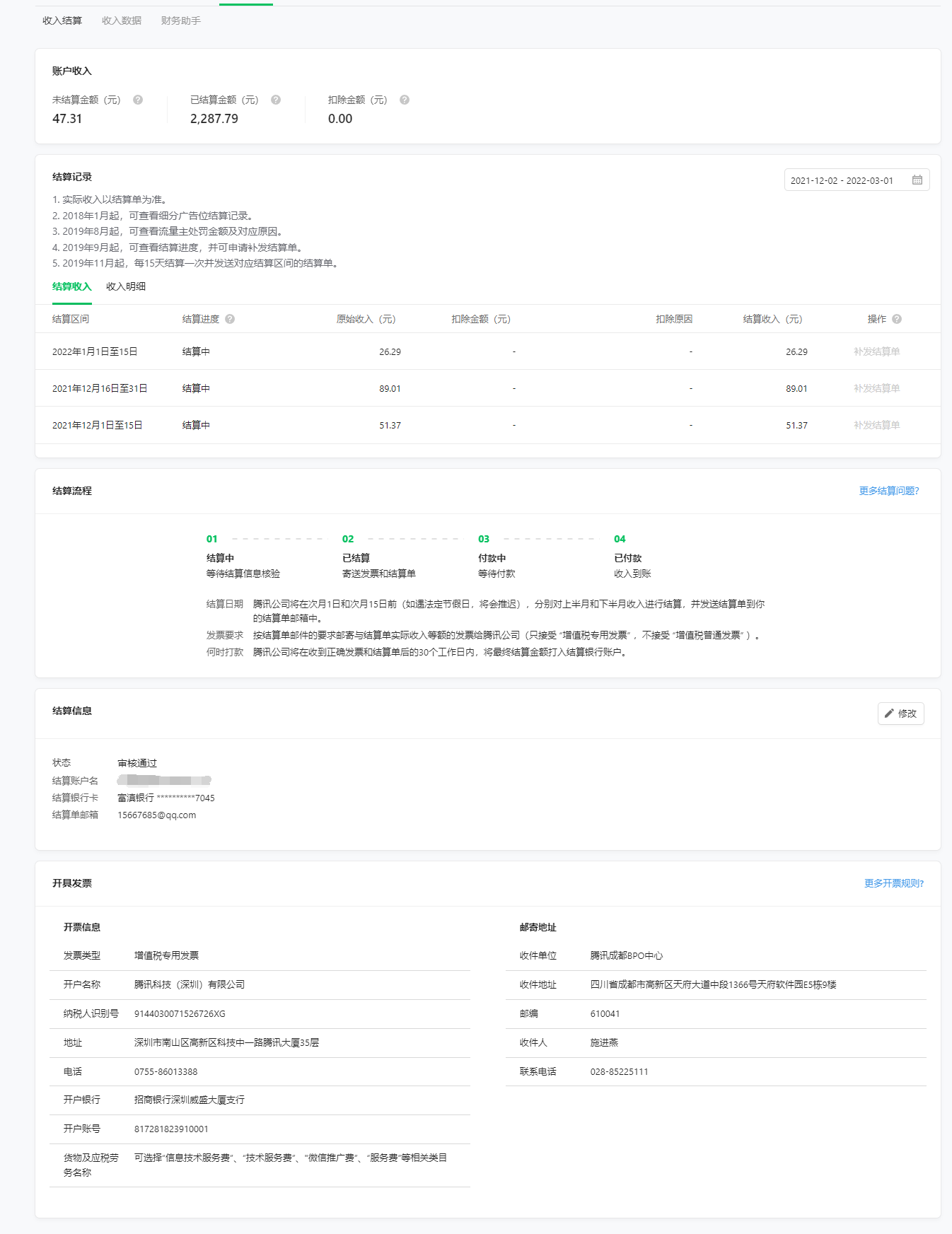 个体或者个人,坐等收入,公司的,需要给腾讯邮寄发票。