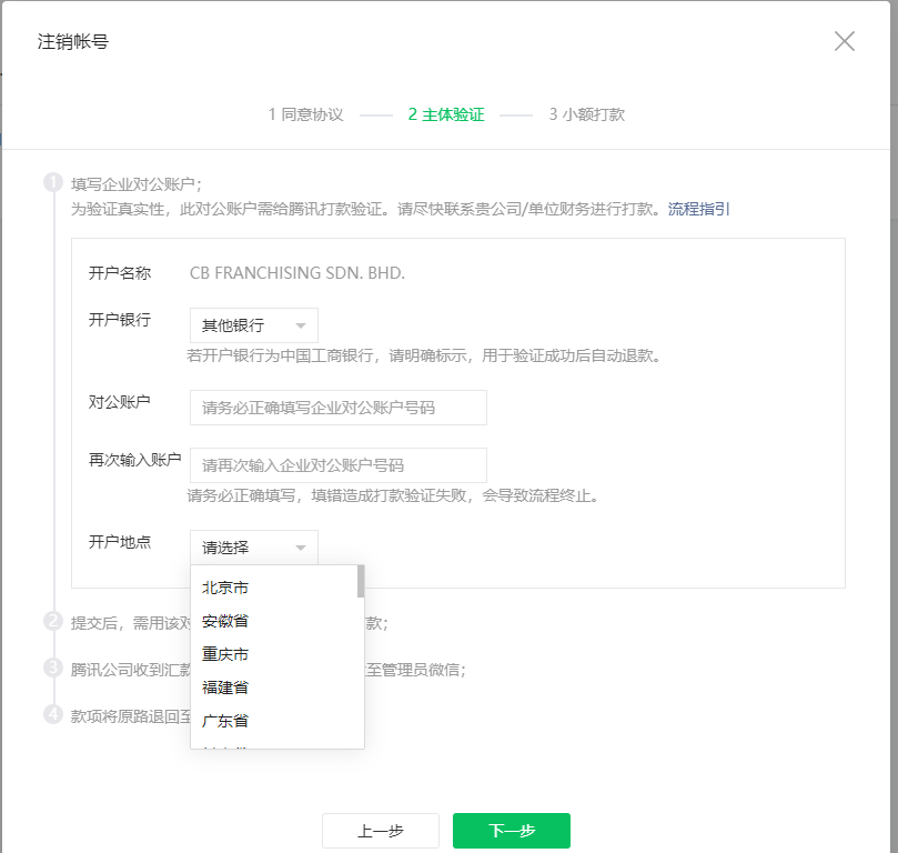 请问打款认证可以用其他主体账户吗?如果不可以该怎么操作?银行非中国地区