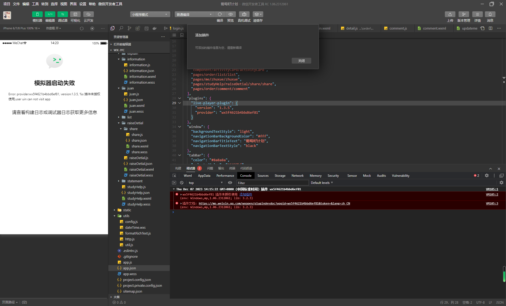 小程序有开通直播入口,插件代码插入就报错,这个怎么搞
