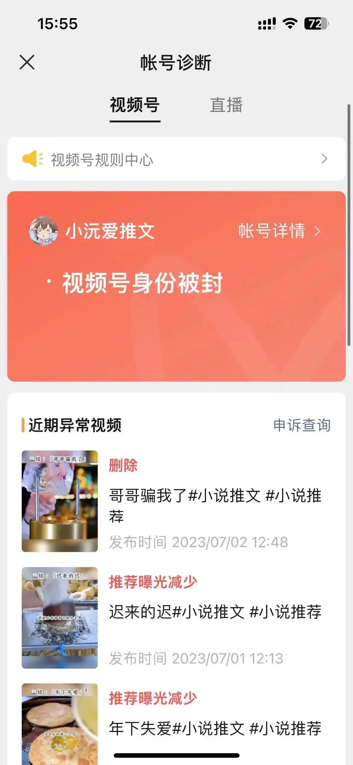 账号是做推文的,在7月2日,发布视频后,私信收到有违规提醒,被禁言一天,就立即打开视频号准备马上删除,结果就显示账号被停止使用,本人深刻认识到自己的错误,现已熟读并了解《微信视频号运营规范》,保证类似错误绝不再犯,不给官方大大添麻烦,不给客服小姐姐小哥哥添麻烦,求官方大大再给我一次改正的机会,帮忙解封。