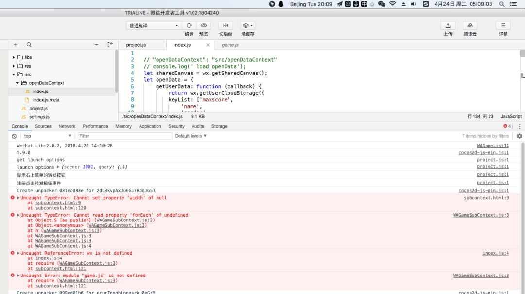 今天在把开发者工具更新到v1.02.1804240版本后,运行项目会出现错误,并导致在开放数据域中无法或取到wx对象,在之前版本的开发者工具上没有错误,在手机上预览也有出现错误.同组的其他项目在更新后也出现了同样的报错.尝试更改调试基础库从1.9.94到2.02均会出现同样的错误.具体错误如下,请问该如何解决?