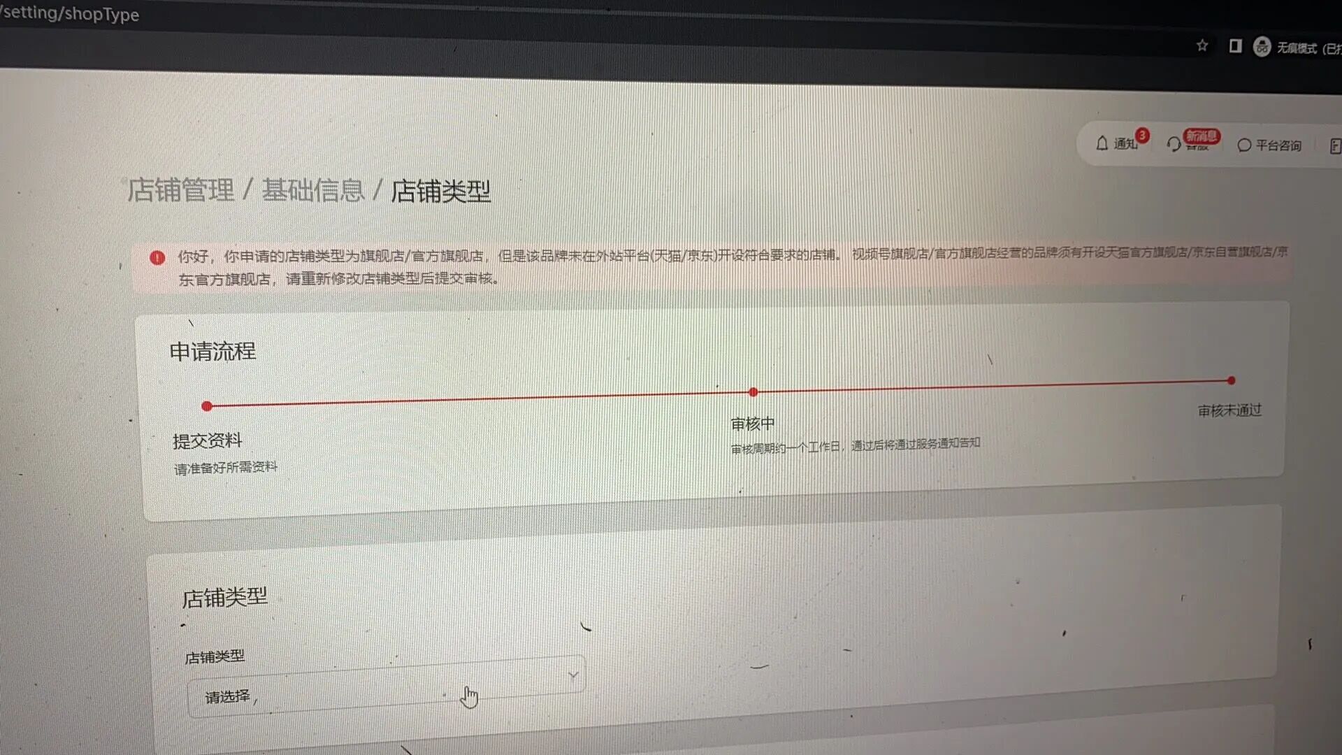 你好,你申请的店铺类型为旗舰店/官方旗舰店,但是该品牌未在外站平台(天猫/京东)开设符合要求的店铺,视频号旗舰店/官方旗舰店经营的品牌须有开设 天猫官方旗舰店/京东自营旗舰店/京东官方旗舰店,请重新修改店铺类型后提交审核,谢谢。