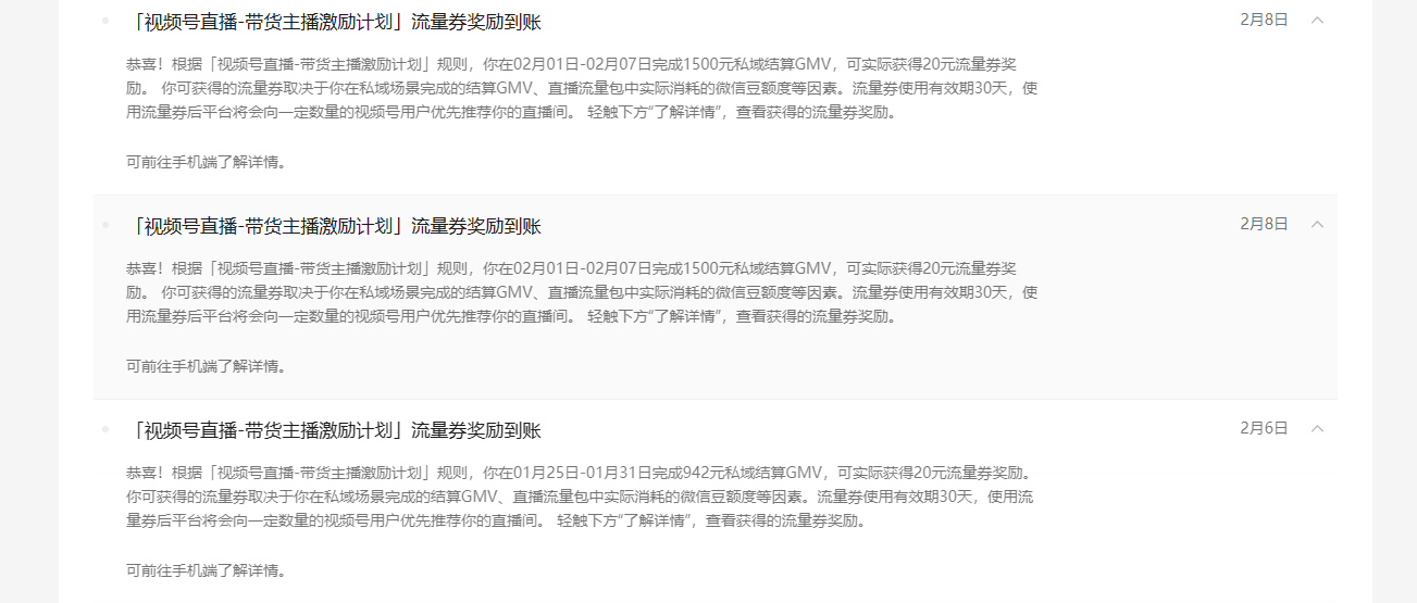 2月份的时候还有流量劵奖励,每次多多少少总有点,如果瑕疵直播需要加热,流量劵不够,可以买微信豆凑足1000微信豆(因为加热起步价就是1000微信豆),现在倒好,竟然没有流量卷奖励了,连微信豆都涨价了。
