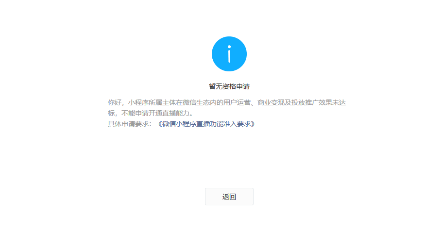 小程序所属主体在微信生态内的用户运营、商业变现及投放推广效果未达标,不能申请开通直播能力。