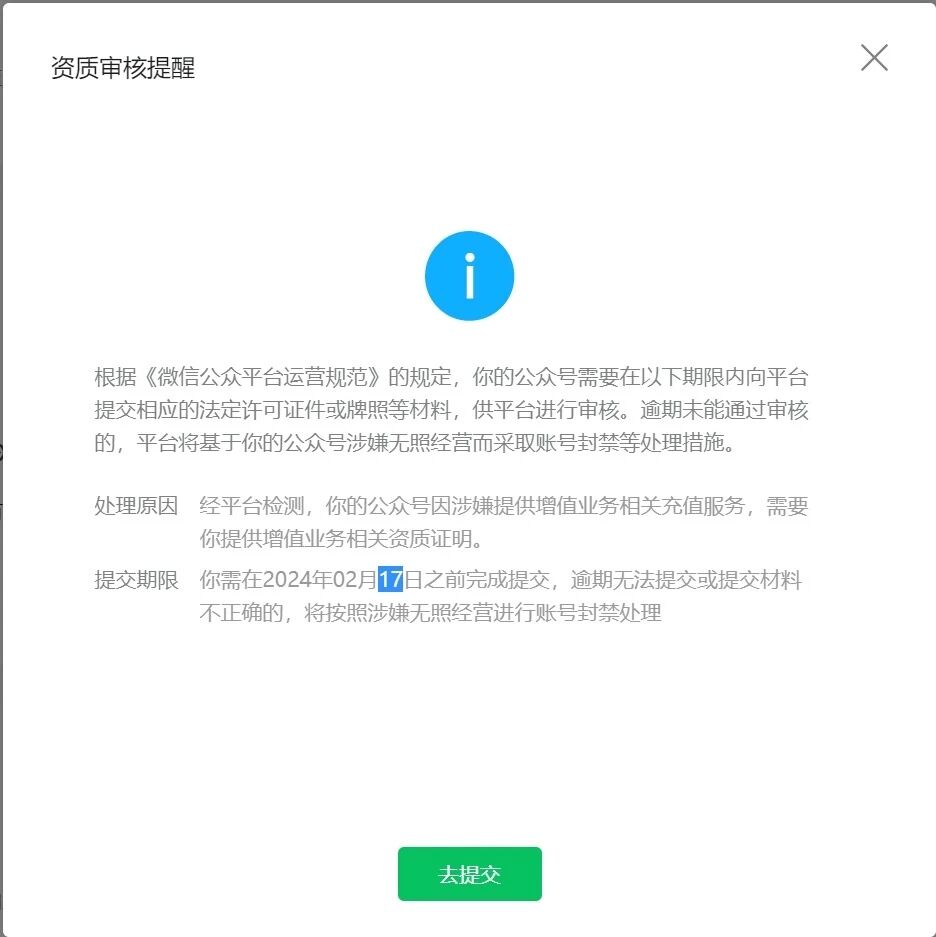 根据《微信公众平台运营规范》的规定,你的公众号需要在以下期限内向平台提交相应的法定许可证件或牌照等材料,供平台进行审核。逾期未能通过审核的,平台将基于你的公众号涉嫌无照经营而采取账号封禁等处理措施。处理原因经平台检测,你的公众号因涉嫌提供增值业务相关充值服务,需要你提供增值业务相关资质证明。