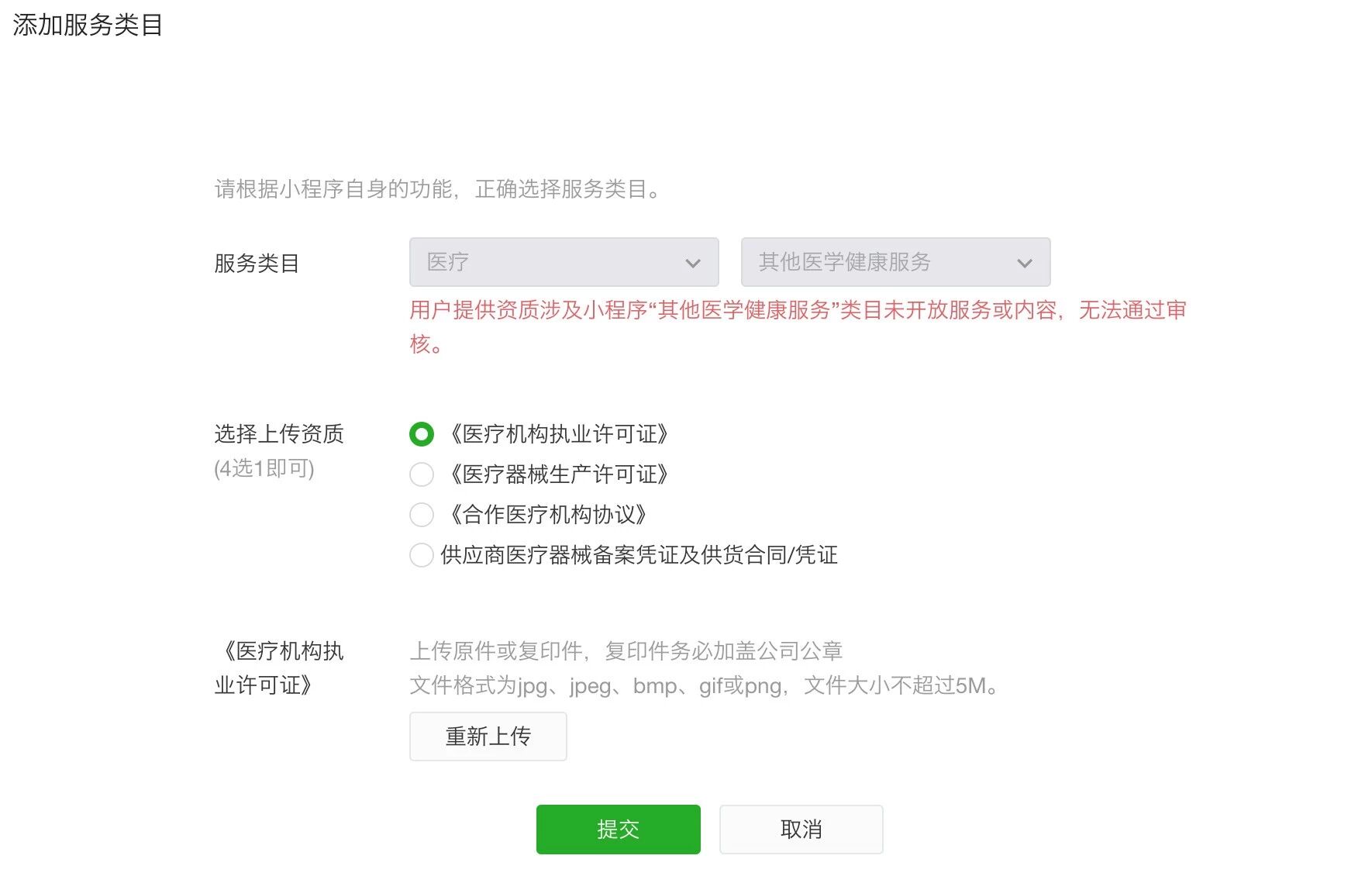 请问:「用户提供资质涉及小程序“其他医学健康服务”类目未开放服务或内容,无法通过审核。」,类目未开放服务或内容是什么意思?不开放这个类目给我们新增吗?如果是的话,那为什么叫我们要补充这个服务类目呢?有点自相矛盾哦?如果不是,那为什么又没有审核通过呢?