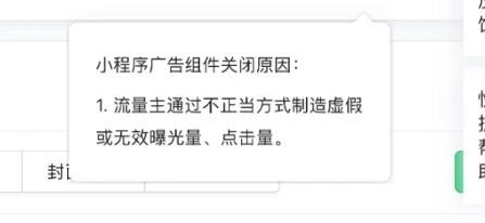 小程序广告组件关闭原因:违反小程序流量主广告组件规范,广告展示关闭7天,到期后请重新提交审核。 流量主通过不正当方式制造虚假或无效曝光量、点击量。 appid:wx0e778d366680071b