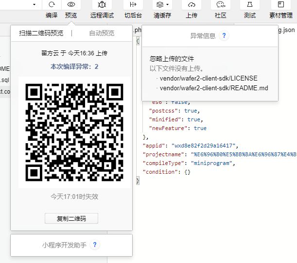 你好,小程序音视频demo在开发者工貝上传后发现有两个忽略上传的文件。手机扫描二维码预览沒有出文档展示的页面,是什么错误造成的呢?