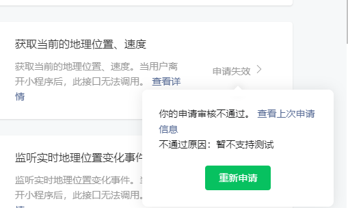 你好,核实到你的小程序wx.getLocation接口申请不通过,根据你提交的申请信息可知申请该接口是用于【用于获取用户位置】,申请原因描述不明确且无法在小程序内体验到具体场景,建议描述具体与接口相关使用场景,再麻烦上传小程序申请接口相关录屏重新提交审核。