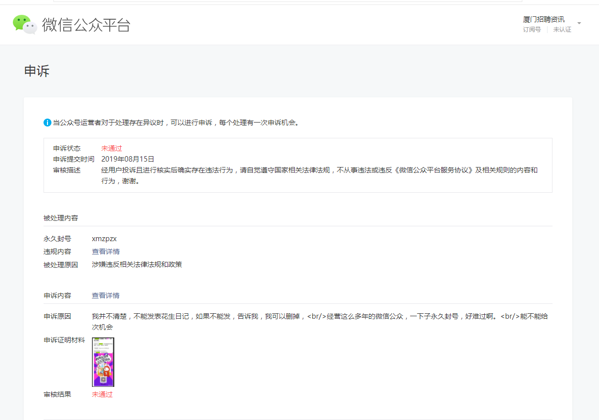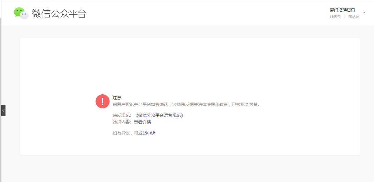 微信公众号:xmzpzx(厦门招聘资讯),永久封号,这么严重。