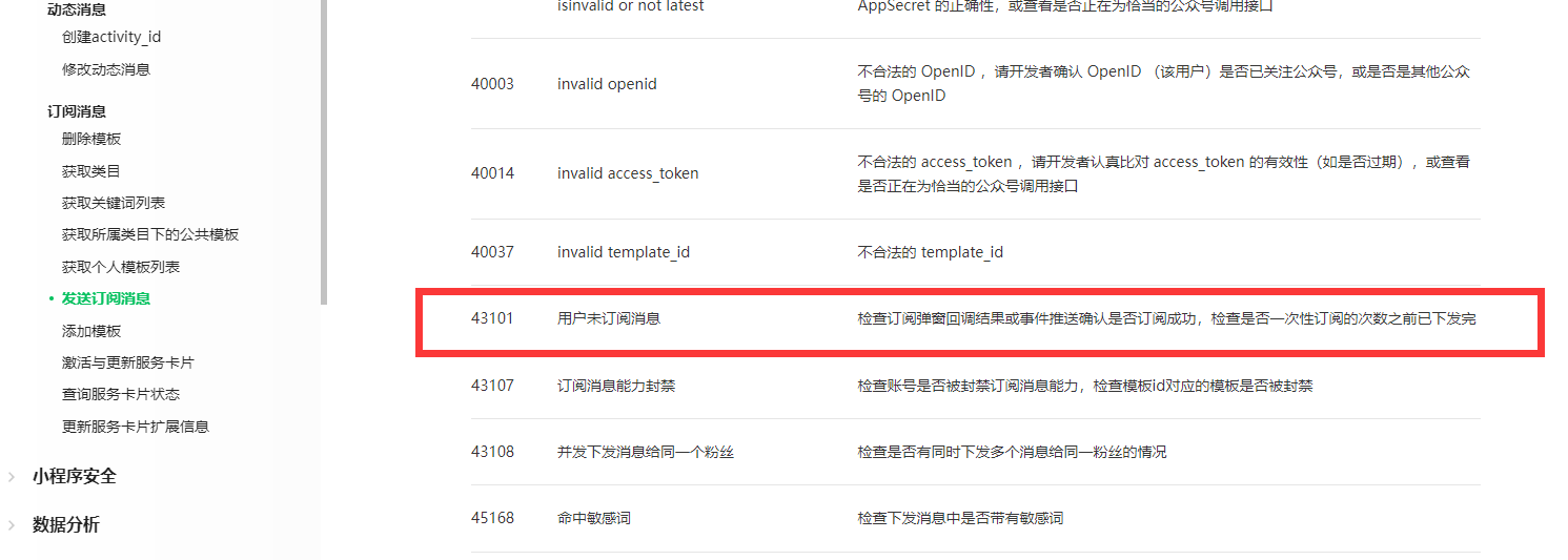 我用服务端推送消息,调用https://api.weixin.qq.com/cgi-bin/message/subscribe/send?access_token={accessToken},返回errcode:$43101,msg:$user refuse to accept the msg rid: 661ff381-7e9fd9f8-5c88ec7a。我确定我在小程序的设置-》通知管理中打开了接收通知,但是没有用,昨天我还收到了6条通知,但是后续就没有再收到,今天一条通知都没有收到,我的日志记录全是43101这个错误。