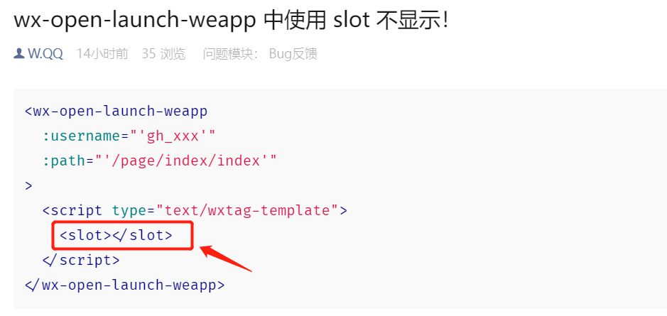<wx-open-launch-weapp :username="'gh_xxx'" :path="'/page/index/index'" > <script type="text/wxtag-template"> <slot></slot> </script> </wx-open-launch-weapp>