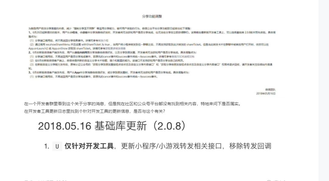 图片不是很清楚,大致是说小程序分享功能,在分享时候,我们无法获知是否是分享成功,也无法在分享后立即获取群信息。我并没找到该公告。不知道是否属实。