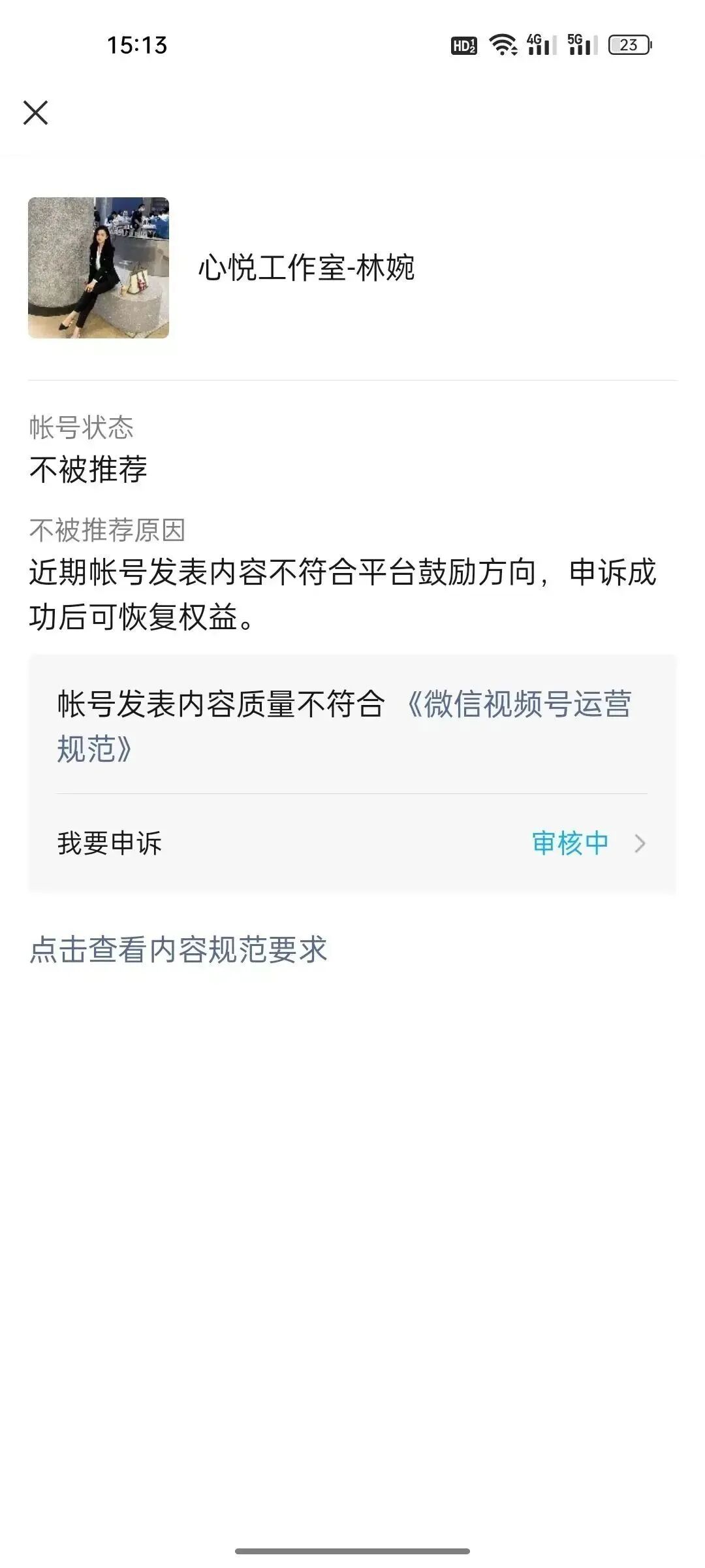 问题描述:账号目前处在不被推荐状态,已发表10条原创真人出镜视频,已在账号后台进行申诉,截止到发帖日期已经3天时间,一直在审核状态,目前没有任何反馈,我已经按照提示整改视频内容,并且认识到了之前操作的不当之处,希望恢复一下账号的推荐权限,非常感谢!
