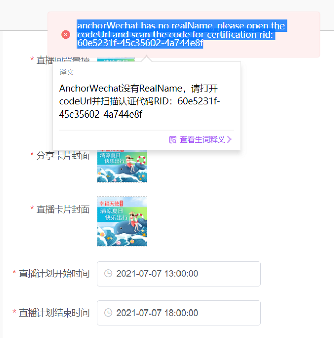 主播微信号:zuiaiyewan008 创建直播间的时候报出异常“anchorWechat has no realName, please open the codeUrl and scan the code for certification rid: 60e521e4-26761055-6a1609cb”。