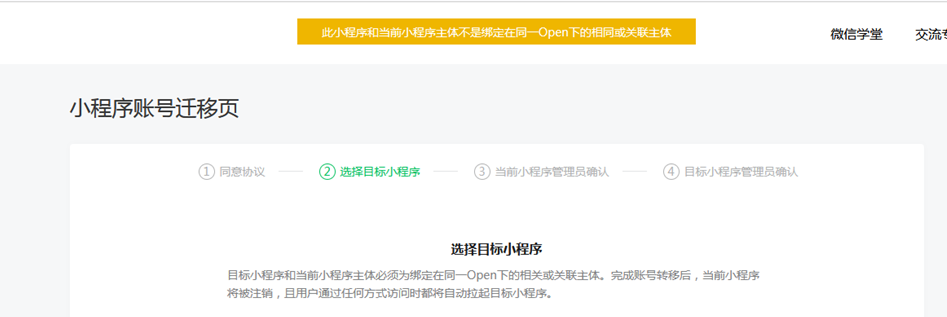 用A主体认证的开放平台,已完成关联了B主体、C主体。现在要将B主体的小程序迁移到C主体,提示”此小程序和当前小程序主体不是绑定在同一0pen下的相同或关联主体“。 关联后不是 A、B、C三个主体都互相关联吗?难道还要另外再用B主体认证个帐户,关联C主体才能完成迁移 ?