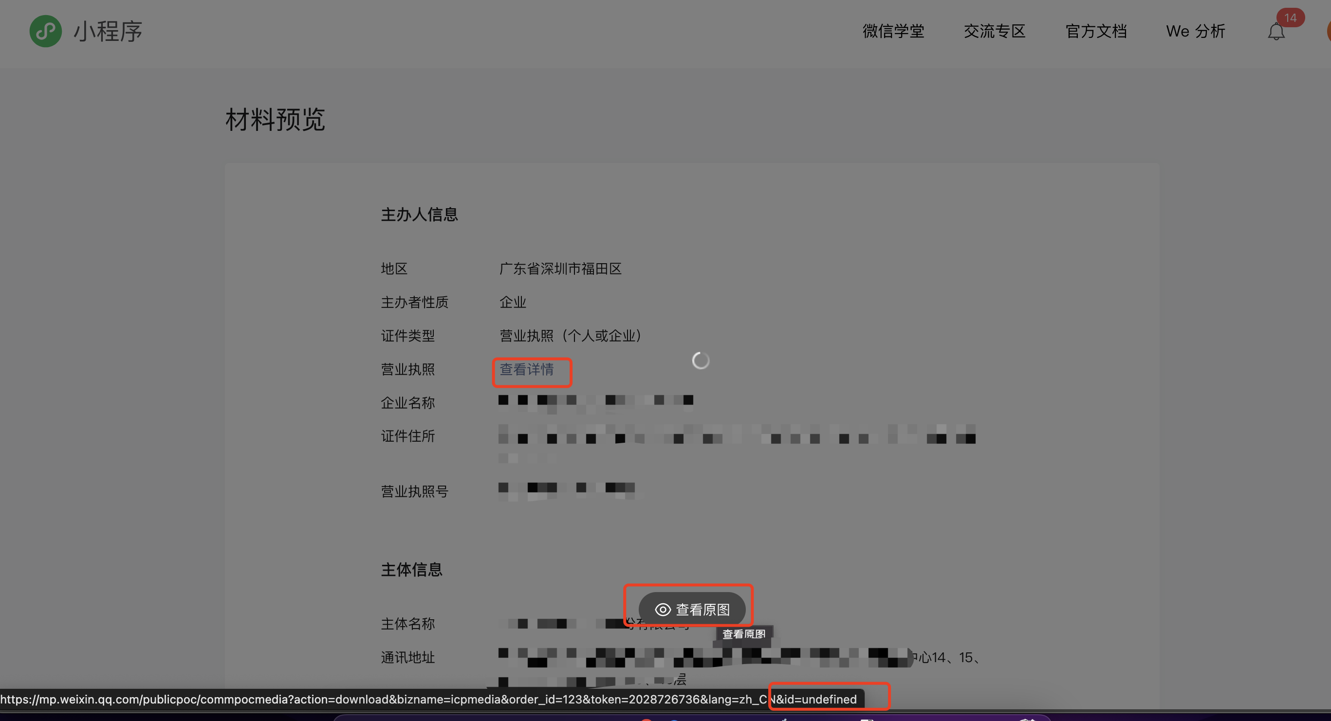 点击查看已备案的营业执照图片,界面一直在loading当中,可以发现图片地址最后的id值为undefined,是否因为这个而无法查看已备案的图片,麻烦请复测修复此问题
