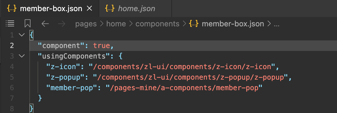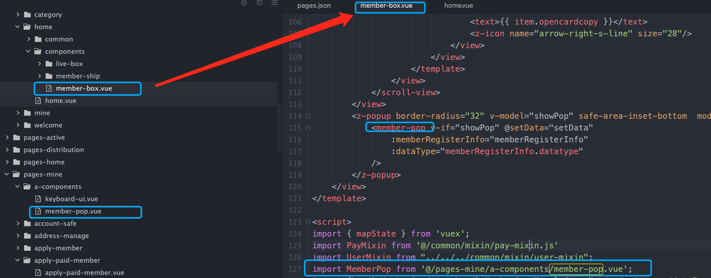 在主包home的组件member-box里去用分包pages-mine的一个组件member-pop,注意:是在主包home的组件里去用,不是注册到页面home 的pages的这个页面,而是在home的子组件member-box去使用