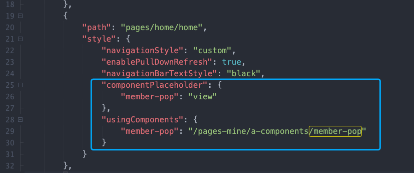 在pages.json中配置了主包home,home页面的子组件member-box怎么配置componentPlaceholder占位符引用分包组件member-pop呢??