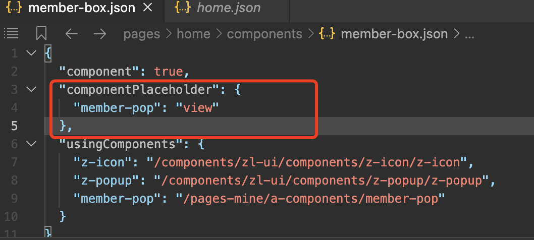可以看出主包home的组件member-box确实没有配置componentPlaceholder占位符
