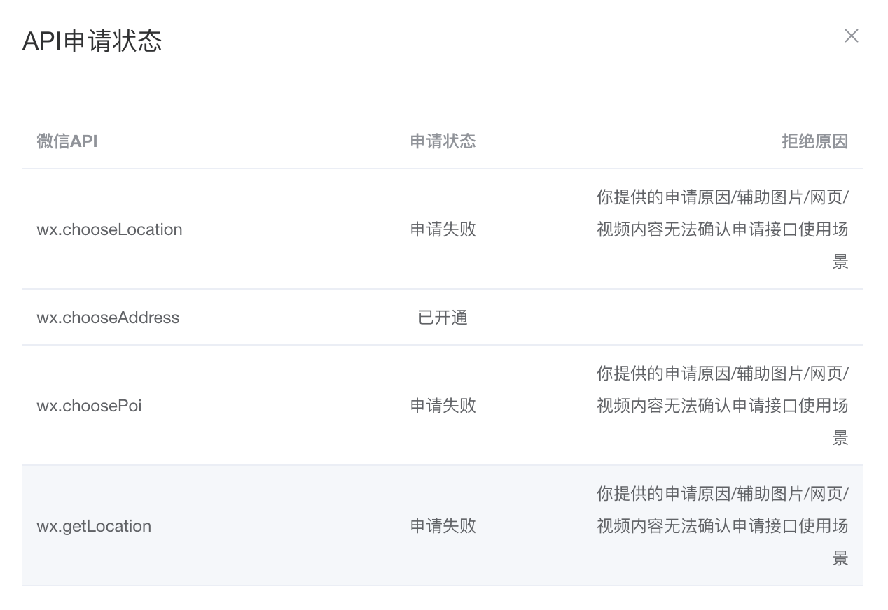 你好,申请wx.getLocation接口需同时满足类目开放范畴和接口使用场景开放范畴两个条件才可通过审核,建议在提交接口审核时详细描述下申请接口使用场景,并提供小程序内申请接口相关截图或录屏辅助审核,以便快速通过审核。详情参考:https://developers.weixin.qq.com/miniprogram/dev/api/location/wx.getLocation.html
